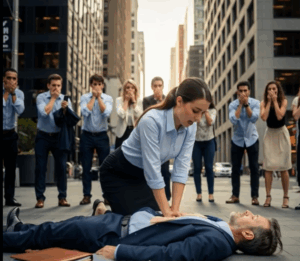 Al doblar la esquina, Emma notó un grupo de personas formando un círculo en la acera. Por curiosidad, aminoró el paso. Pronto, la curiosidad se transformó en alarma: en el centro del círculo, un hombre yacía desplomado sobre el concreto, pálido como un fantasma, el pecho inmóvil. Vestía un traje impecable, propio de alguien acostumbrado al éxito, pero nada de eso importaba ahora. No respiraba.