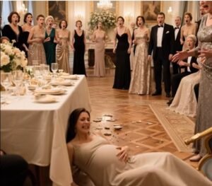 El salón entero se congeló. Las copas temblaron, los cubiertos cayeron. Thomas se levantó de un salto, su silla arrastrándose ruidosamente. Corrió hacia Emily, que yacía en el suelo, con el dobladillo de su vestido manchado de sangre. El pánico llenó sus ojos.