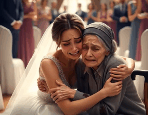 La salida de Emily del salón del Hotel Turner fue más dramática que cualquier entrada nupcial. Pasó por la atónita multitud, con el maquillaje de novia corrido y el vestido manchado, llevando a su madre frágil en un brazo, apoyándose en su viejo bastón.