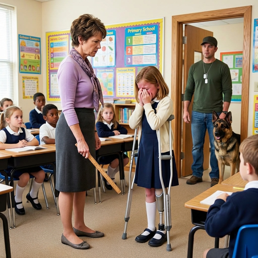 Jack se agachó junto al escritorio de Emily, asegurándose de que estuviera cómoda. “Volveré después de clase, cariño”, le susurró. Al salir, Rex se detuvo en el umbral. Sus ojos ámbar se fijaron en la maestra, su cola se puso rígida y un gruñido bajo, casi imperceptible, retumbó en su pecho. Jack frunció el ceño. “¿Tranquilo, chico?”, murmuró, tirando suavemente de la correa. Pero mientras se alejaban por el pasillo, una inquietud fría se instaló en el estómago del veterano. No sabía que aquel gruñido no era solo desconfianza animal; era una advertencia. Detrás de esa puerta cerrada, bajo la apariencia de una educación perfecta, una tormenta silenciosa y cruel estaba a punto de desatarse sobre lo que Jack más amaba en el mundo.