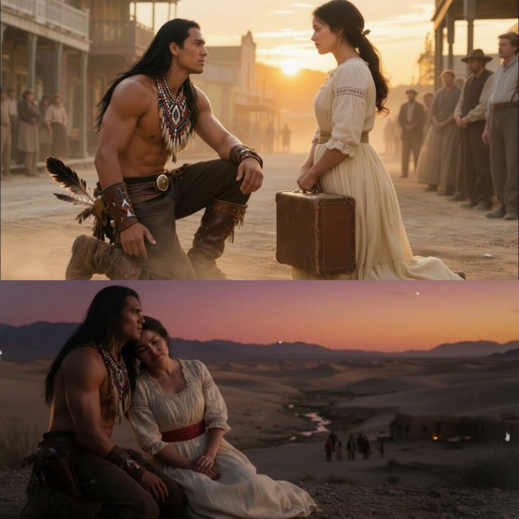 Días después, bajo el sol ardiente de la plaza de San Miguel, Clara tomó una decisión. Frente a los colonos y los apaches reunidos, se colocó la cinta carmesí alrededor de la cintura. El murmullo de la multitud se apagó cuando Nantan se arrodilló ante ella, ofreciéndole su mano. No fue solo una boda, fue un pacto. Los colonos, sorprendidos por la valentía de Clara y la nobleza de Nantan, aceptaron el acuerdo de paz que sellaba la unión.