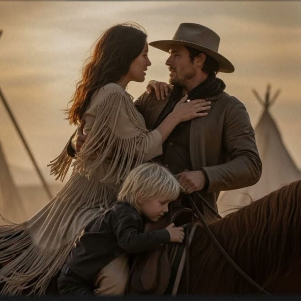 Al llegar, el aire olía a carne quemada y madera carbonizada. Un campamento apache destruido, tipis reducidos a cenizas, cuerpos esparcidos como muñecos rotos. Bandidos, sin duda. En el centro, de pie entre las ruinas, estaba ella: Yana, viuda apache de ojos negros como la medianoche, cabello trenzado con cuentas de turquesa y un vestido de gamuza que ondeaba como bandera de luto. En sus brazos, una niña pequeña de cabello rubio, y a sus pies, un niño de ojos fieros.