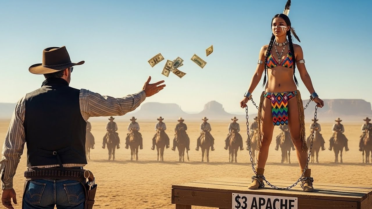 Y allí estaba ella: una joven apache, manos atadas, el cabello enmarañado, los ojos ardiendo de desafío. Miraba a la multitud sin inclinar la cabeza. Aquello no era una venta común, sino una exhibición cruel de poder y dominio.