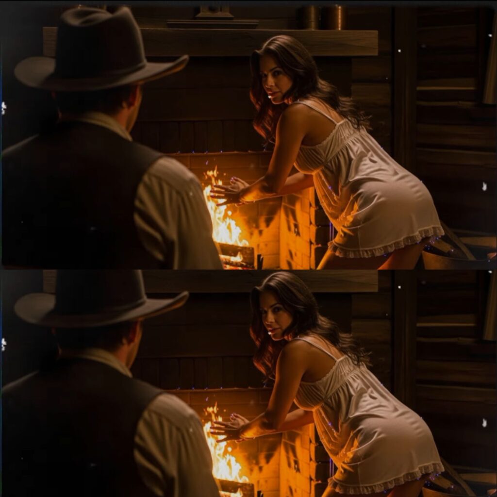 La viuda se inclinó sobre el fuego crepitante, su falda blanca rozando las llamas como un fantasma en la noche del desierto. El joven vaquero, con el sombrero ladeado y el revólver aún caliente en la cartuchera, no podía apartar la mirada.