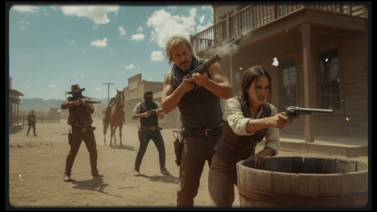 La batalla rugía. Vaqueros contra bandidos. Elena disparó desde una ventana, acertando al Cuervo Negro en la pierna. Don Rodrigo irrumpió, pistola en alto. —¡Mía!