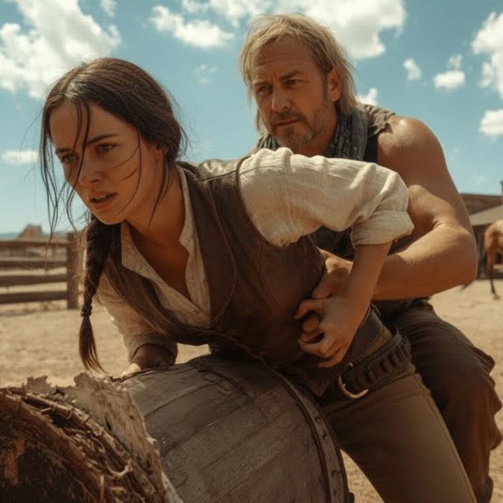 En el polvo ardiente de un pueblo olvidado en el desierto de Sonora, donde el sol quemaba como plomo derretido y los coyotes aullaban promesas de muerte, Elena se retorcía sobre un barril viejo, su vestido rasgado colgando como los harapos de un cadáver. El ranchero, un hombre de barba gris y músculos curtidos por años de arrear ganado salvaje, la sujetaba con firmeza por los hombros.