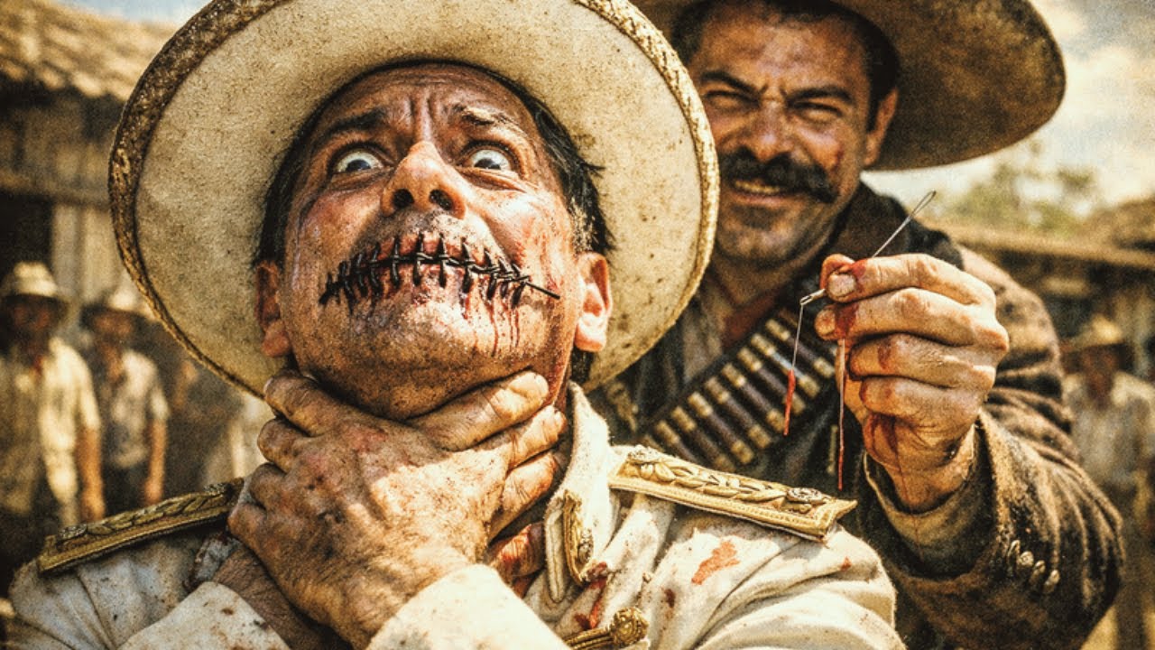 El pueblo contuvo la respiración. Dos soldados sujetaron a don Refugio, lo arrodillaron en el suelo y Morales, sin prisa ni vacilación, le cosió la boca puntada por puntada. La sangre escurrió por su barbilla, manchando la tierra sedienta de horror. Cuando terminó, Morales anunció: “En Hidalgo del Parral, las bocas que se quejan se cosen. Quien tenga hambre, que lo aguante en silencio”.