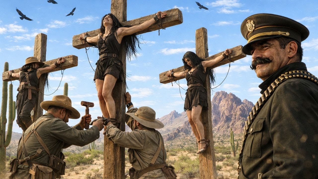 El coronel, enfurecido porque un pelado mugroso lo desafió frente a sus hombres, ordenó algo que ni el mismo diablo hubiera imaginado. Mandó construir tres cruces en medio del desierto, a 5 kilómetros del pueblo. Arrastró a las tres hermanas hasta allá, frente a su padre amarrado, y las crucificó vivas, mientras el viejo Esteban gritaba como animal herido.