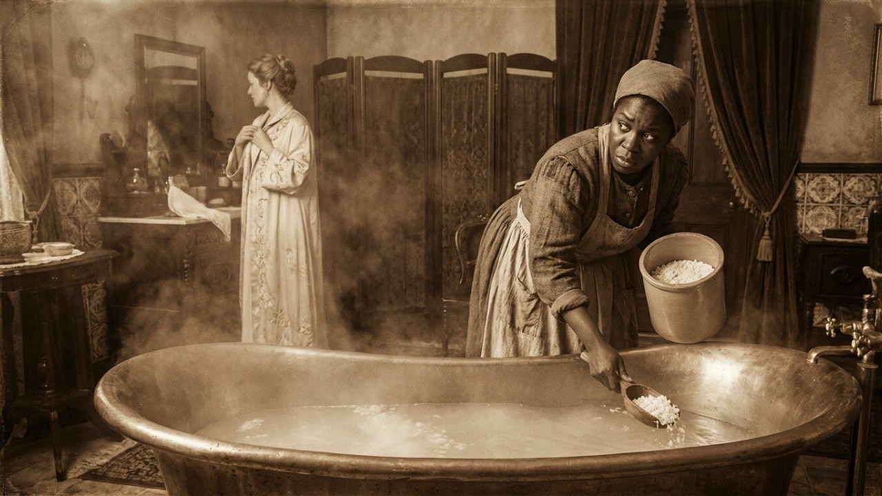 Elena, con la mirada fija en la puerta de la habitación de la condesa, preparó el baño en silencio. La tina de cobre, ahora llena de agua blanca como la leche, comenzaba a burbujear suavemente. Elena sabía que la sosa cáustica comenzaría a reaccionar en cuanto la condesa se sumergiera en el agua caliente, haciendo que su piel se disolviera lentamente, como un recordatorio de los años de crueldad que había infligido.