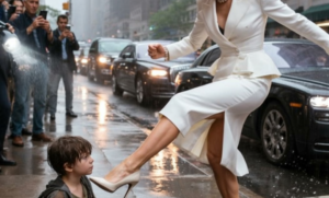 La gente se giró. Los teléfonos se levantaron. La multimillonaria, conocida por su refinada elegancia, estaba regañando a un niño sin hogar en la calle. Su ira estalló y lo empujó hacia atrás. El niño tropezó y aterrizó en un charco.