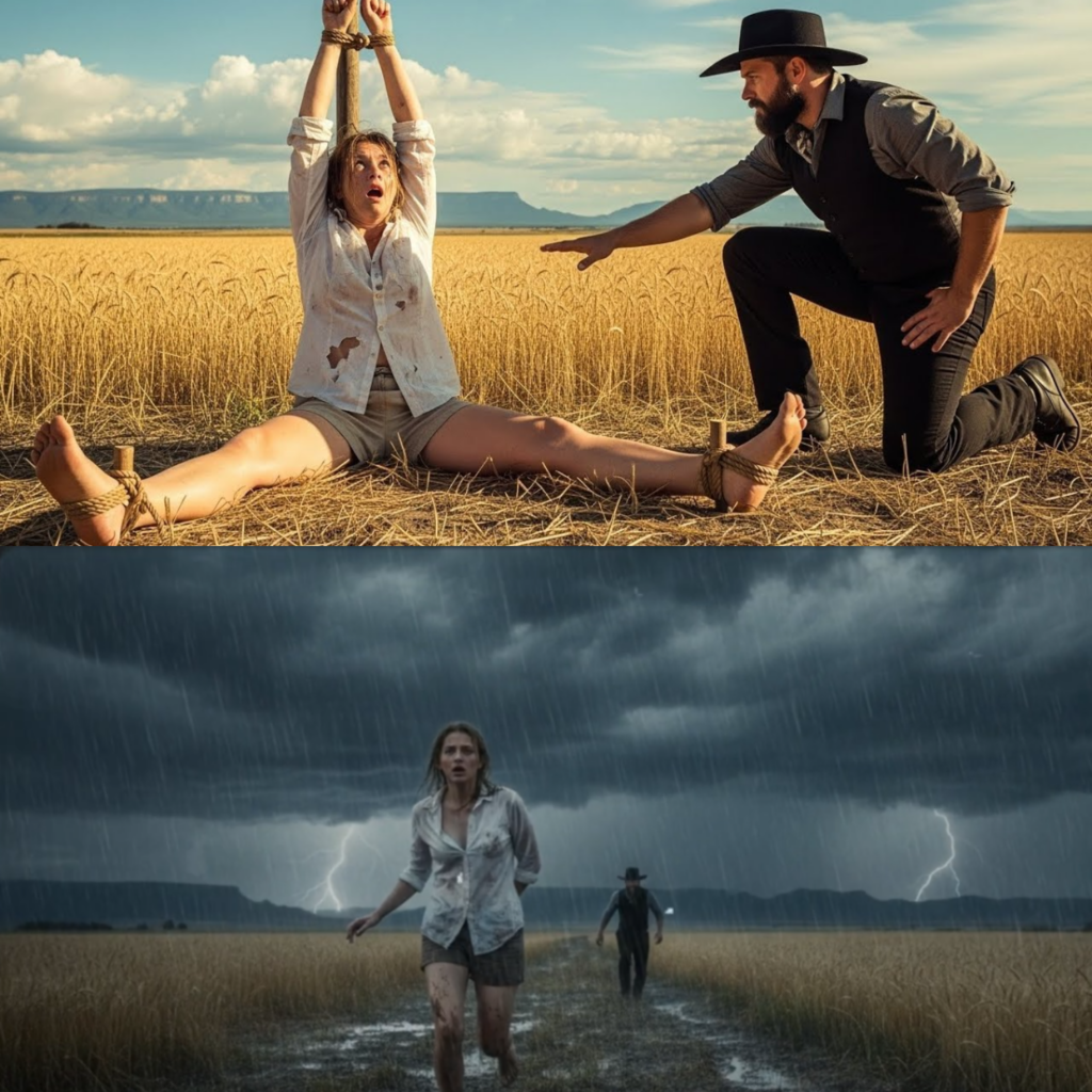 Detrás de ella, los gritos furiosos del ranchero la perseguían, pero Emily no miró atrás. La tormenta se convirtió en su aliada, golpeando el techo del granero, ocultando su escape, lavando el miedo y dejando solo la voluntad cruda de sobrevivir.