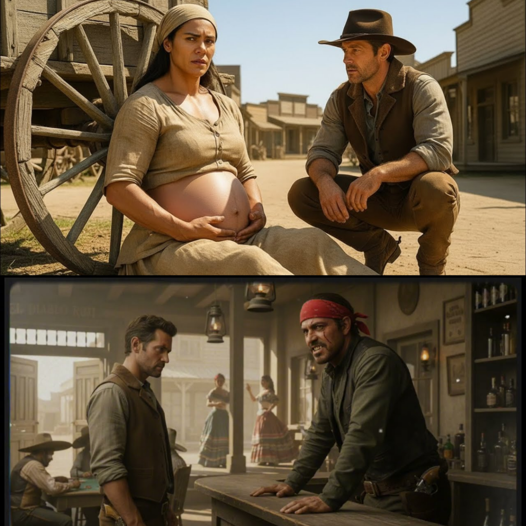 Jack llevaba días sin ver alma viva, solo cactus y serpientes de cascabel. Pero ese día, al acercarse al pueblo, vio algo que lo hizo detenerse en seco. Allí, junto a una carreta abandonada al borde del camino, estaba una figura imponente. Era una joven mujer sentada en el suelo arenoso con una barriga hinchada por el embarazo avanzado. Medía al menos 1.80, alta como un hombre robusto, con hombros anchos y brazos musculosos que hablaban de una vida de trabajo duro. Su piel morena brillaba bajo el sol, y su cabello negro caía en mechones sucios sobre un rostro anguloso pero hermoso. Llevaba un vestido raído de algodón, manchado de polvo y sangre seca. En sus brazos acunaba algo envuelto en una manta vieja, un bebé diminuto que lloriqueaba débilmente.