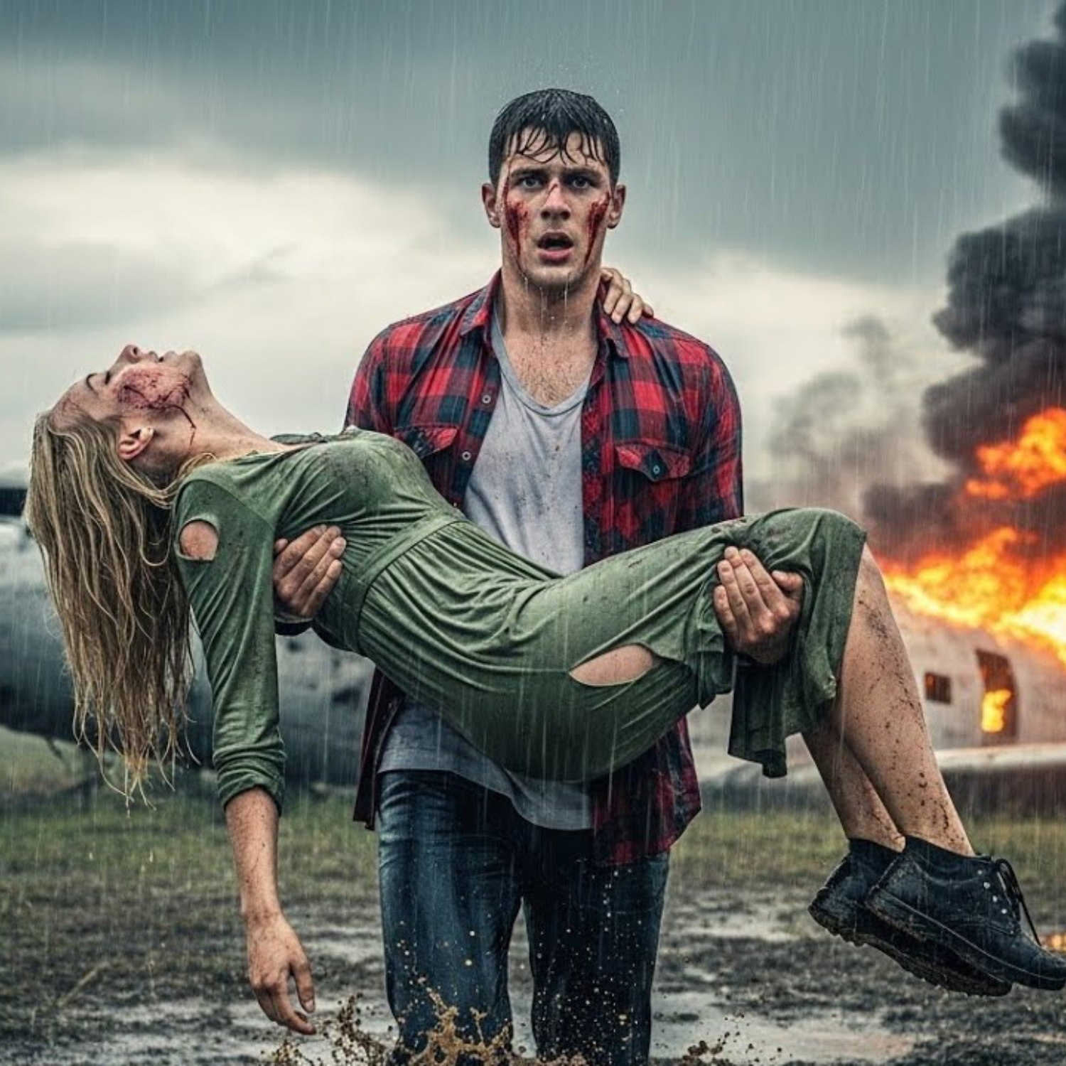Ya estaba fuera de los escombros cuando Earl llegó. Ella había arrastrado su cuerpo a través del barro por su cuenta. Una joven mujer, tal vez en sus 30 años, con el cabello rubio largo y pegado a su rostro, y un corte en la frente que había sangrado hacia su mejilla y se había secado. Llevaba un vestido verde, de todos los colores, no ropa de vuelo, ni ropa de viaje sensible, un vestido verde ahora rasgado en el dobladillo y cubierto de tierra negra. Ella levantó la vista hacia él a través de la lluvia y dijo en una voz tan pequeña que casi no la oyó sobre el viento: