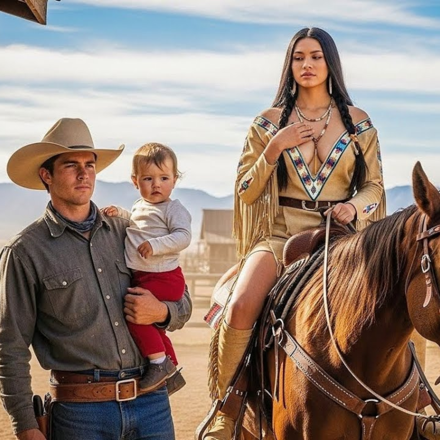 Hasta que una mañana, Cole estaba fuera de su porche, con el viento polvoriento acariciando la tierra abierta, sosteniendo a su pequeña Emma como si fuera lo único suave que le quedaba en la vida. Entonces escuchó el ritmo de cascos acercándose desde la distancia. La figura a caballo se hizo más clara: era una mujer, una mujer apache de cabello largo y negro, con un rostro que no mostraba ni miedo ni duda, solo certeza, como si hubiera viajado mucho para llegar justo a ese momento.