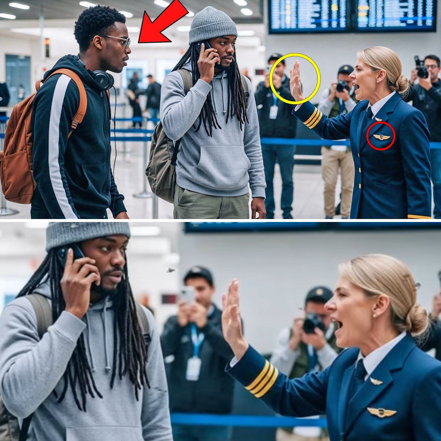 La terminal se convirtió en un campo de batalla, y el epicentro del caos fue Brenda. La presión se acumuló rápidamente mientras los pasajeros esperaban saber si su vuelo seguiría en pie. La creciente indignación de los viajeros, unida a la revelación de quién era realmente Trey y Kobe, rompió la tensión. Brenda, que había ejercido su autoridad con desprecio, ahora se encontraba atrapada en su propia mentira. La misma arrogancia que había usado para señalar a los hermanos se volvió contra ella. Los pasajeros comenzaron a notar el patrón de discriminación, y las cámaras no tardaron en captar la escena.