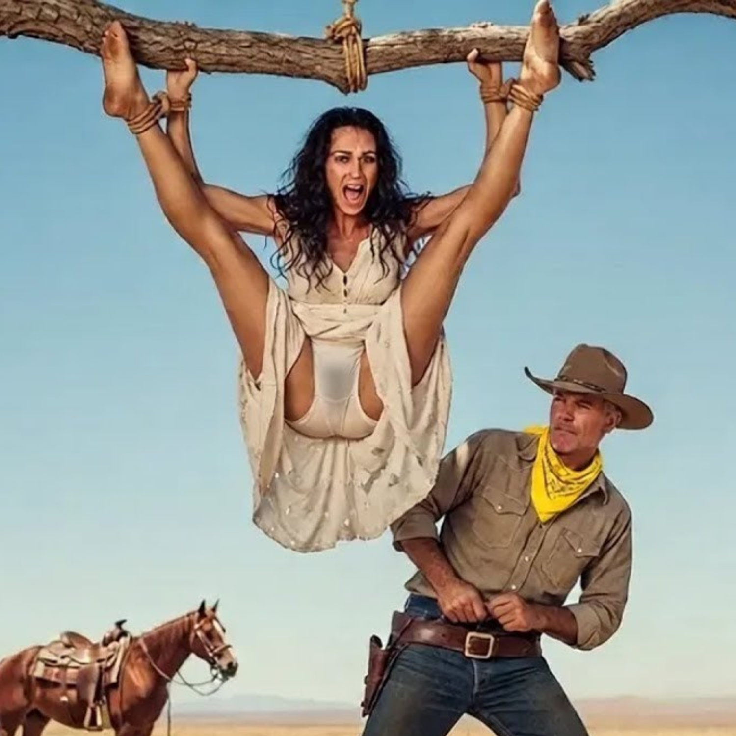 Todo comenzó con un grito que no era de este mundo. Una mujer llorando, suspendida en lo alto de un álamo, atada como si la vergüenza fuera el único abrigo permitido bajo el sol de Wyoming. Sus muñecas ardían rojas por la cuerda, el vestido rasgado lo justo para humillarla, las piernas atadas de forma cruel y la brisa levantando la tela que ella intentaba proteger. Cuando vio al ranchero, el pánico y la humillación la tiñeron de rojo y gritó lo único que le quedaba: “No mires ahí.” Pero él no miró como querían los que la pusieron allí. Miró lo suficiente para cortarla y ver la trampa.