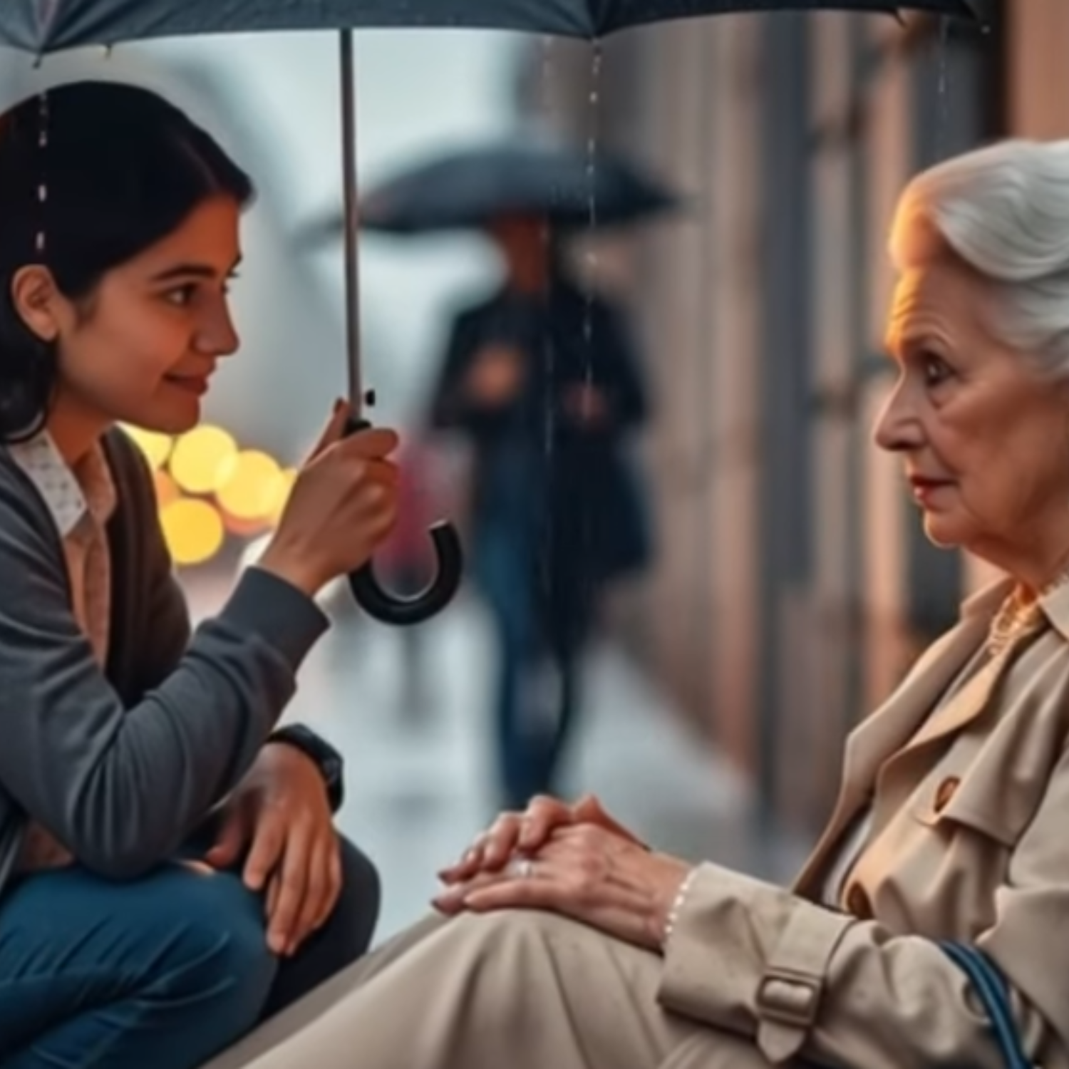 La lluvia caía copiosamente sobre la ciudad, transformando las calles en espejos líquidos que reflejaban las luces amarillentas de los postes. La gente pasaba apresurada, protegida por paraguas negros, rostros ocultos, pasos urgentes. Nadie miraba a los lados, nadie nunca miraba en medio de aquella prisa silenciosa. Una mujer estaba sentada en la acera fría, recostada contra una pared de hormigón, con el abrigo beige empapado, las manos temblorosas. Su bolso azul descansaba a un lado, intacto, como si aún guardara la dignidad que el tiempo intentaba robarle. Miraba fijamente al suelo sin ver nada. Los carros pasaban y salpicaban agua sucia sobre el asfalto. La gente desviaba la mirada. Unos por indiferencia, otros por miedo a involucrarse. Era como si la mujer fuera invisible, hasta que entre todos los pasos apresurados, un par se detuvo. Sofía.