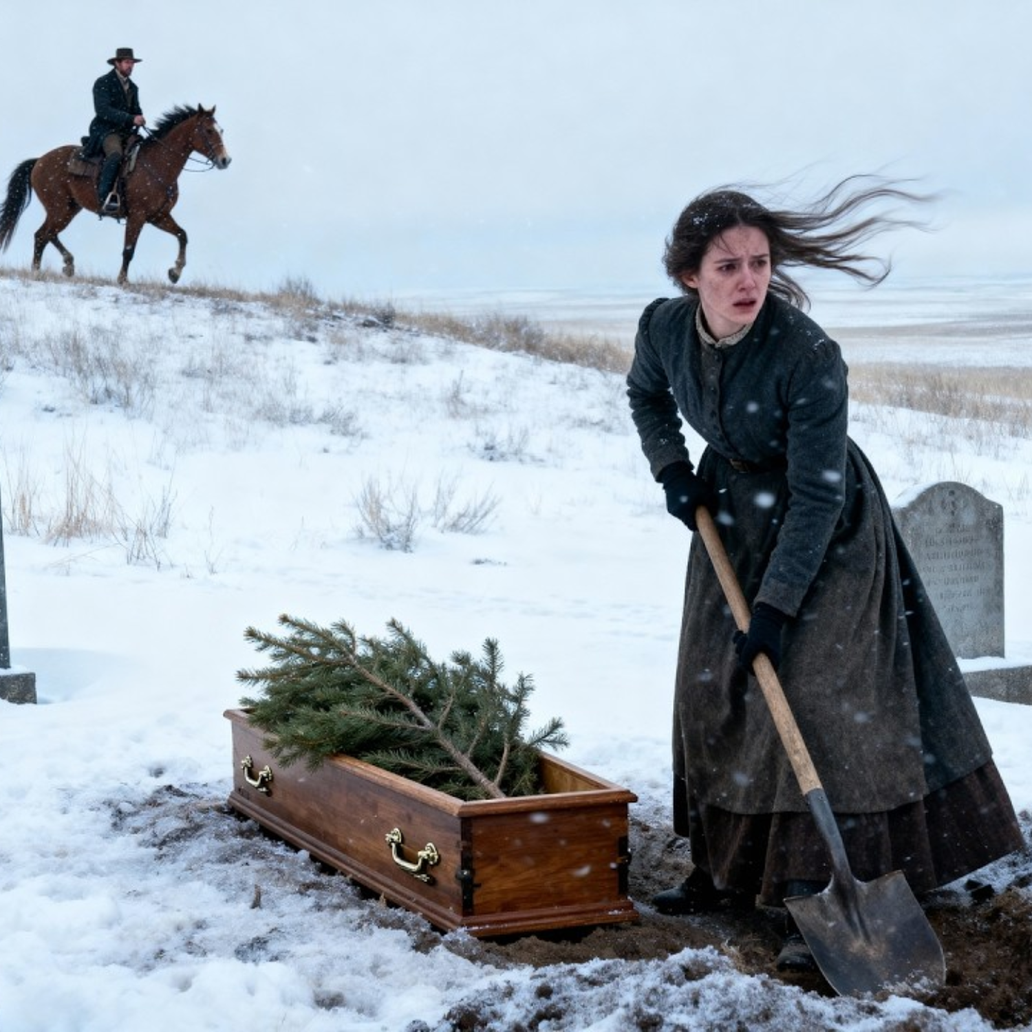 Evelyn no oyó su llegada; el viento arrastraba el sonido sobre la pradera vacía. Luke desmontó despacio, guiando el caballo los últimos treinta metros. Fue entonces cuando vio el pequeño ataúd de pino descansando sobre la nieve junto a ella. El pecho se le apretó. Evelyn blandía la pala, usando todo su cuerpo, pero la tierra no cedía. El filo resonaba contra el suelo, enviando vibraciones por el mango que sacudían sus hombros. Tropezó, se sostuvo, levantó la pala de nuevo.