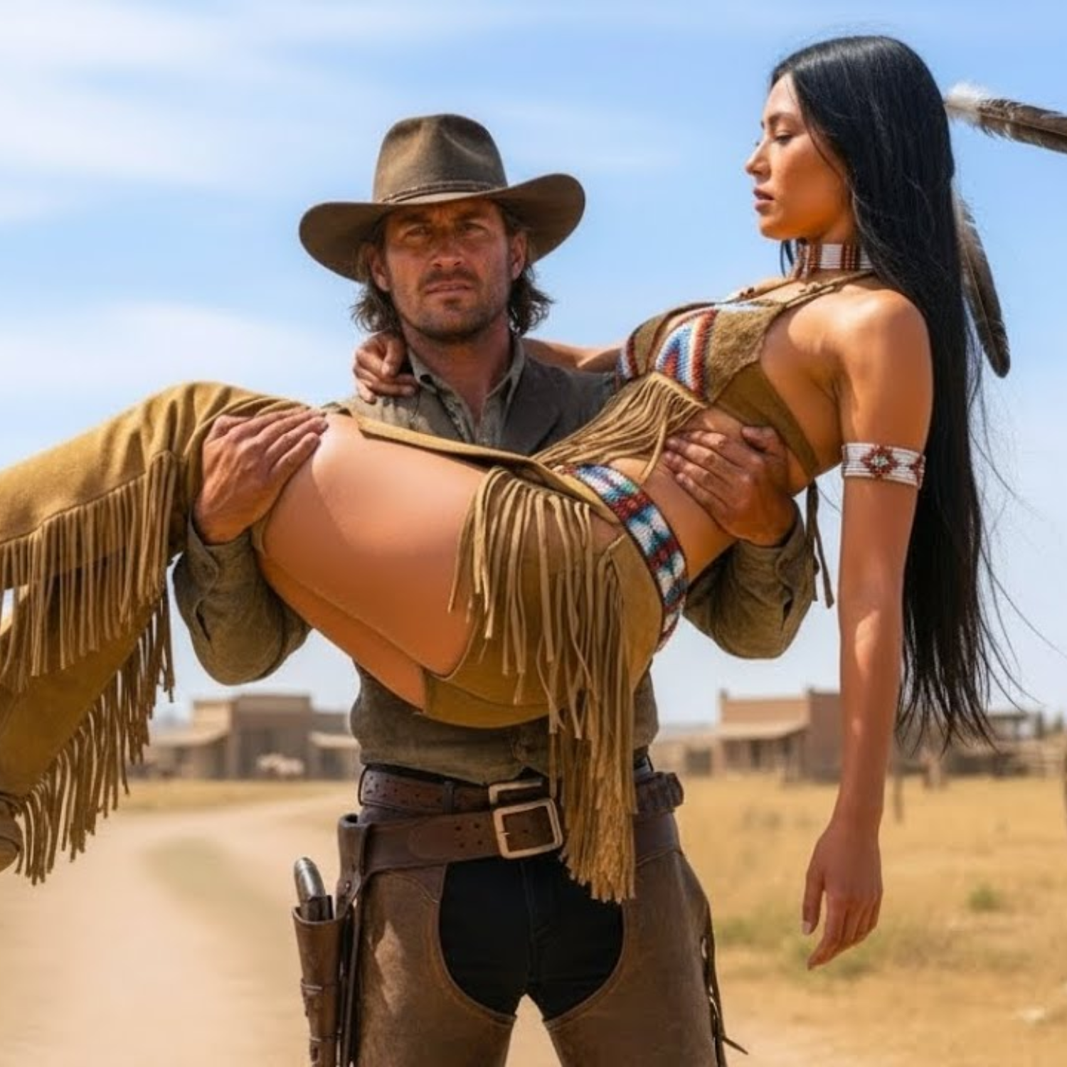 Pero el destino no respeta las creencias. El día que llegó a Red Mesa, el polvo girando bajo los cascos de su semental, el pueblo entero contuvo el aliento. Los hombres se congelaron en medio de conversaciones, un jugador de póker dejó caer sus cartas, el martillo del herrero erró el yunque. Naelli desmontó con un estruendo que parecía el propio suelo reconociendo su presencia. Caminó hacia el puesto de trueque con determinación, sin notar —o sin importarle— que todos la miraban, salvo uno: un vaquero silencioso, sentado en el borde del porche, sombrero bajo, masticando una brizna de hierba como si tuviera todo el tiempo del mundo. No jadeó ni la miró boquiabierto, ni empujó a sus amigos. Solo la observó con curiosidad tranquila, como si fuera una viajera más bajo el sol. Sin miedo, sin asombro, solo quietud.