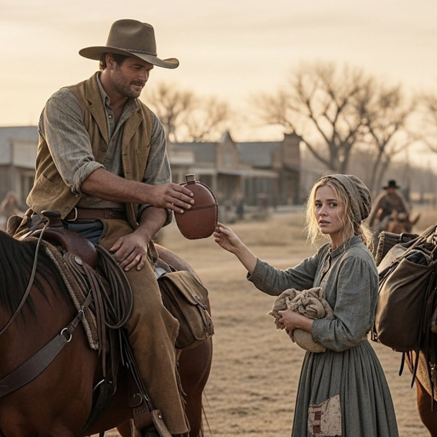 Llegó al borde del pueblo, donde los edificios daban paso a la vasta pradera, y fue allí donde se detuvo, abrumada por la magnitud de todo. El cielo se extendía sin fin en todas las direcciones, y no tenía caballo, ni carreta, ni plan, solo esperanza, la obstinada creencia de que cualquier cosa era mejor que regresar. Fue entonces cuando escuchó el sonido de cascos detrás de ella. Patricia se giró para ver a un hombre montado en un caballo bayo, guiando un caballo de carga cargado con provisiones. Era alto en la silla, con un sombrero marrón polvoriento y un chaleco sobre una camisa de trabajo. Su rostro, marcado por el sol y el viento, mostraba que pasaba más tiempo al aire libre que dentro de las casas.