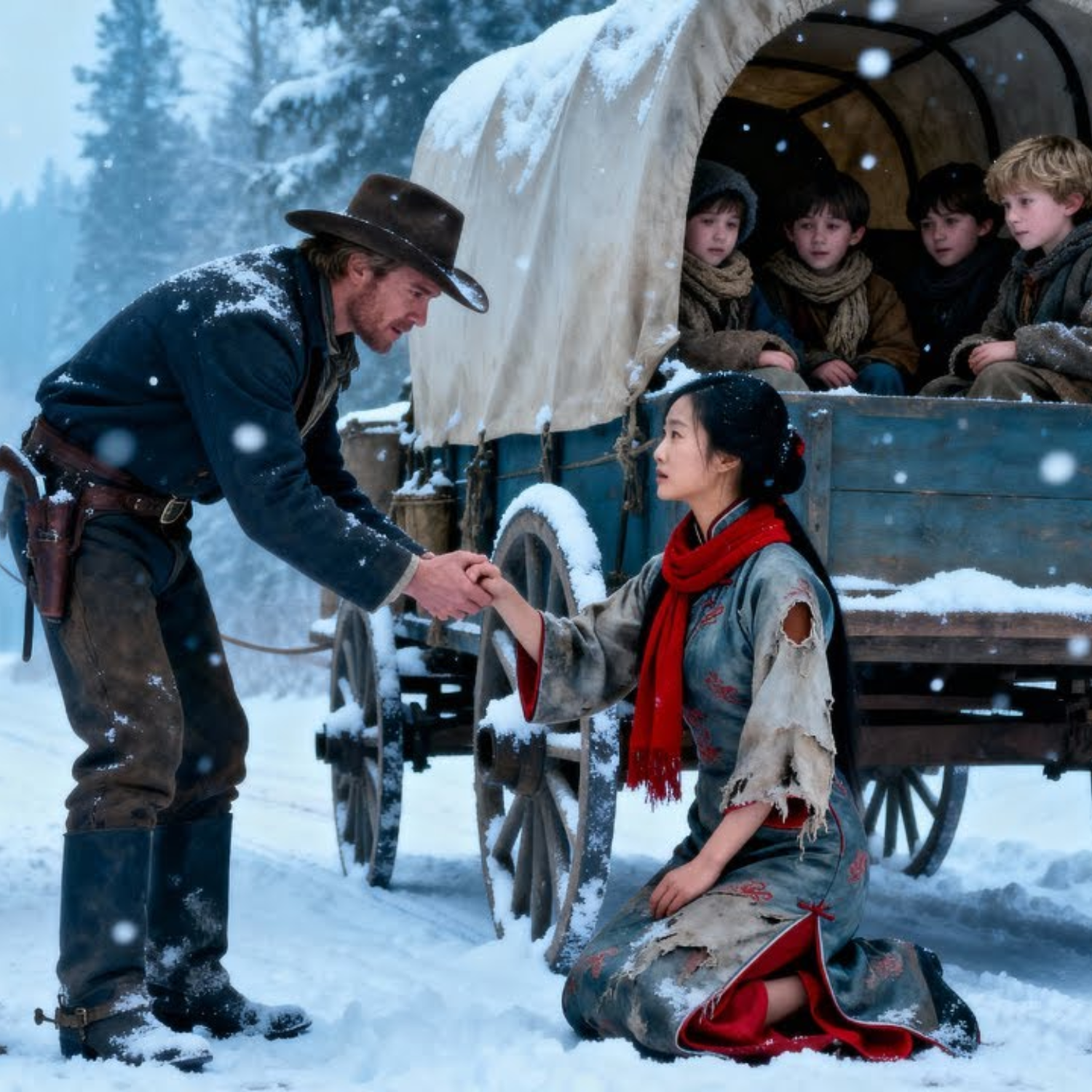 El carro se detuvo a su lado, ruedas quejándose bajo el peso. El hombre llevaba un abrigo de piel de búfalo, rostro oculto bajo un sombrero ancho cubierto de nieve. Barba espesa, vetas de gris, ojos de pedernal: duros, pero no crueles. —Pareces a punto de convertirte en parte de este ventisquero —dijo, voz profunda que vibró en el frío. My Lin intentó negar, pero temblaba violentamente. —Debo seguir… —¿A dónde vas? —preguntó él—. El próximo pueblo está a 30 kilómetros. En esta tormenta, es sentencia de muerte. —No tengo dónde ir —susurró ella. El hombre bajó del carro, imponiendo respeto con sus botas hundidas en la nieve. La observó con atención: vestido de seda asomando bajo un abrigo fino, rasgos orientales, agotamiento marcado en el rostro pálido.