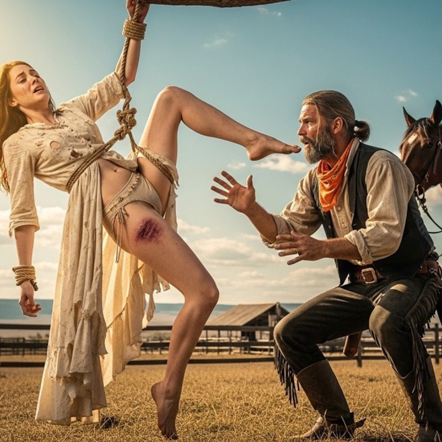 Antes de que sigamos un paso más, déjame decirte esto de forma clara. Lo que estás a punto de escuchar se reconstruye a partir de antiguos relatos y habladurías fronterizas con algunos detalles añadidos para claridad, lecciones y el peso humano de todo. Las imágenes las creé solo para ayudarte a sentir el calor, el polvo y el miedo de ese verano de Kansas. Ahora, quédate conmigo, porque la próxima elección que hace Eli es el tipo de elección que aún divide a los buenos hombres hoy en día. Si esta historia te llega, déjame un comentario para saberlo y te traeré más como esta. Ahora, aquí está lo que la mayoría de la gente no ve. Clare no estaba atada solo por castigo. La dejaron allí como prueba. Silus quería que el próximo hombre viera que podía controlarla. Y Eli vio algo más. Algo que hizo que su sangre se helara. No hubo gritos desde la casa del rancho. No había vecinos montando para ayudar. Nadie venía a ayudar. Eso significaba que esto no era un error. Era una rutina. Y las rutinas no se detienen solas. Si Eli la liberaba, sería perseguido. Si se alejaba, la venderían antes del atardecer.