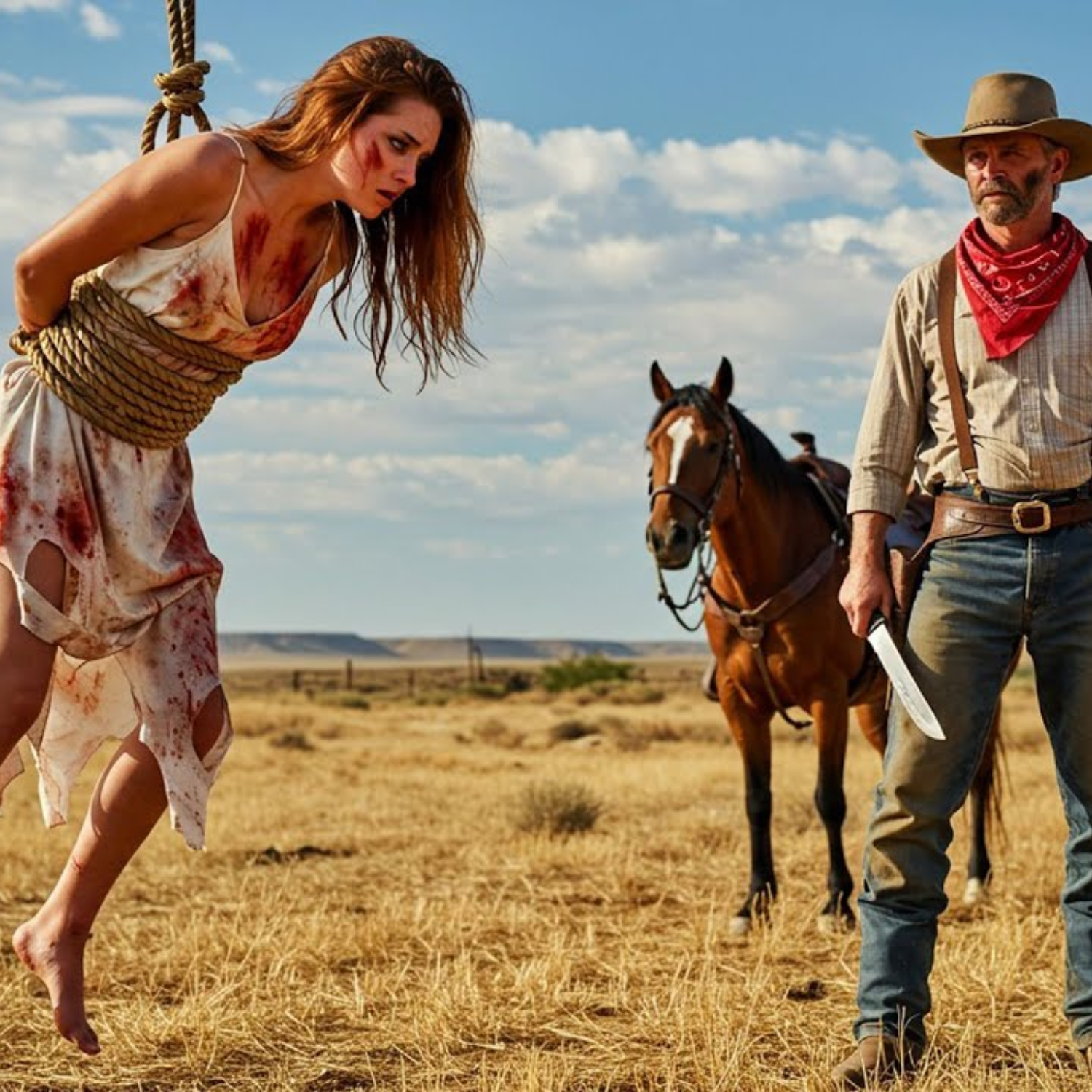 Con un tirón violento, Clay la sacó de la choza. El sol de la pradera la cegó. El viento seco desgarraba su vestido mientras la llevaba hasta un árbol solitario. Lanzó una soga sobre una rama y la alzó. Las fibras ásperas mordían su cintura, brazos atados al cuerpo. Sus pies descalzos dejaron el suelo. Quedó colgada bajo la luz abrasadora, balanceándose como muñeca rota. Clay admiró su obra. “Esto es justicia para la chica que se atreve a desafiarme.” Rosie jadeaba, la cuerda apretando con cada respiración. Los hombros le gritaban de dolor. Un moretón se formaba donde la cuerda cortaba la piel. Su mente giraba, el corazón golpeando, cada segundo era el final. Pensó en la familia perdida, la vida que nunca viviría. El mundo era solo calor y miedo. Clay la rodeaba como un buitre. “Firmarás cuando no aguantes más el dolor.” Su voz se quebró al gritar: “Por favor.” Su cuerpo giraba impotente en el viento. La pradera se extendía interminable, sin pueblo, sin ley, sin amigo que viniera. Solo el sonido de la soga y la risa cruel de su captor.