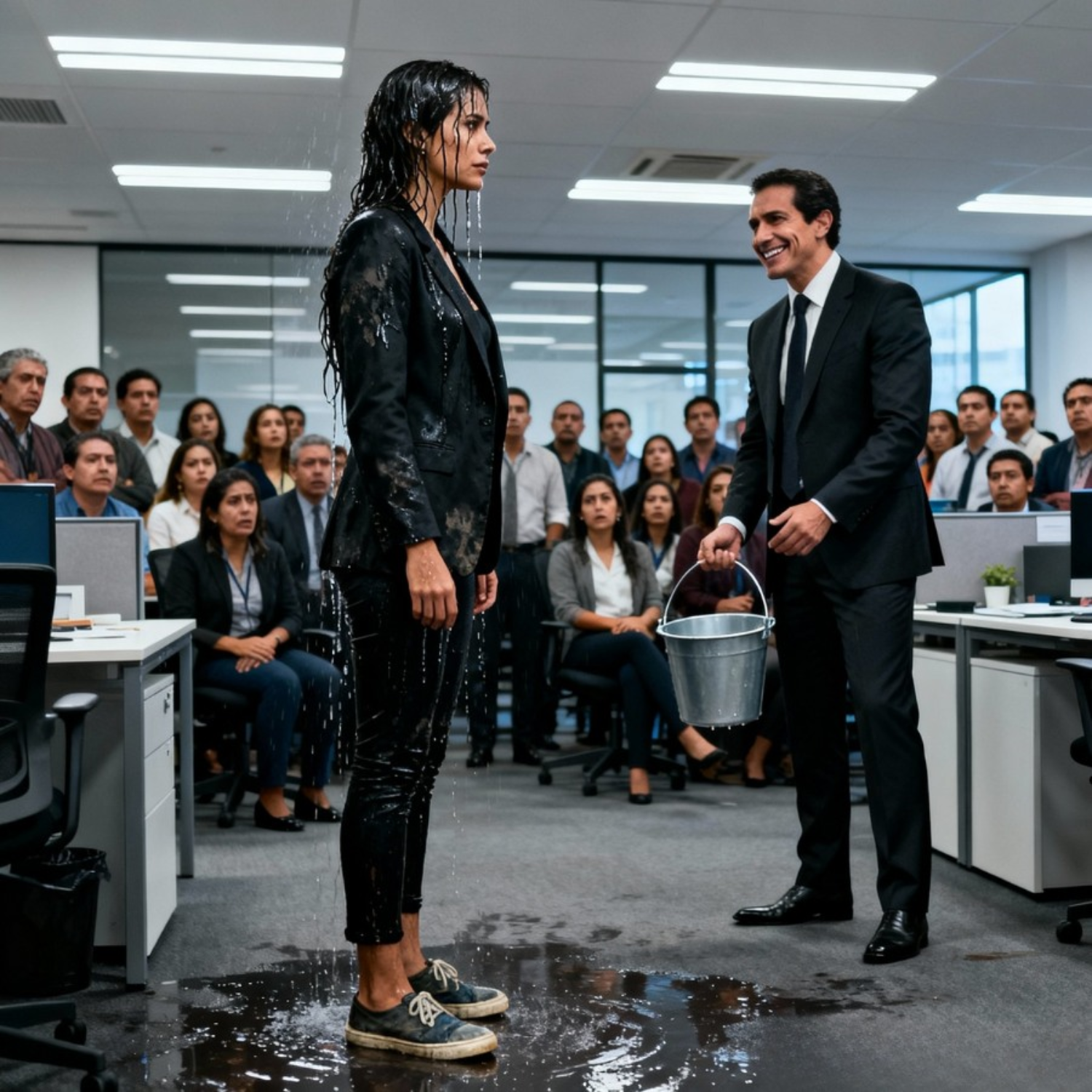 Altavista es una empresa seria, no un refugio para fracasados. Entonces sucedió lo impensable. Julián caminó hacia el dispensador de agua, llenó un balde de limpieza que estaba junto a la fotocopiadora y regresó con pasos calculados hacia Isabel. La oficina se sumió en un silencio de muerte. Todos sabían que algo terrible estaba por suceder, pero nadie se atrevía a intervenir. “A ver si así entiendes tu lugar en este mundo”, murmuró Julián con una sonrisa sádica y sin previo aviso volcó todo el balde de agua fría sobre Isabel.