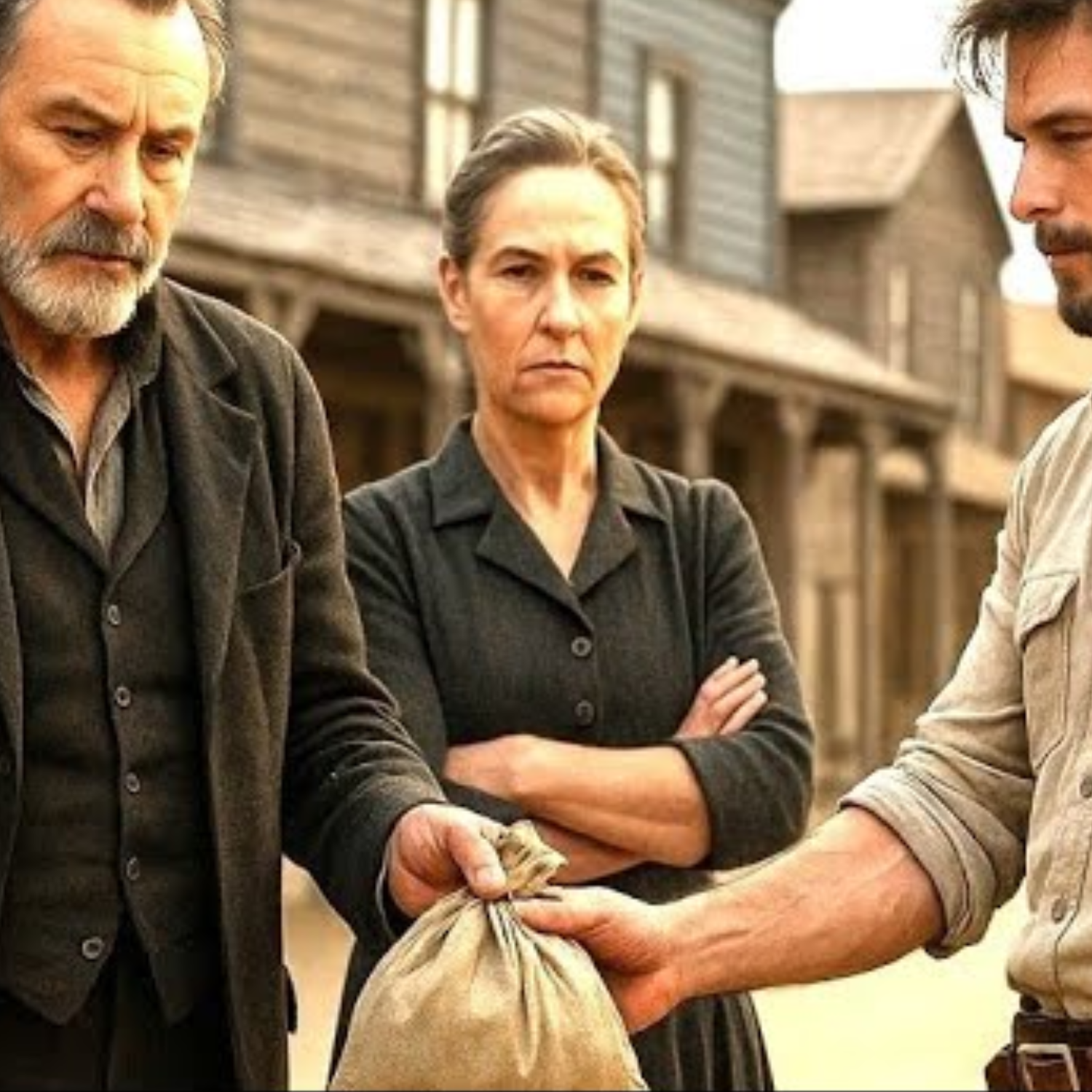 Un hombre dio un paso adelante, de hombros anchos, camisa rígida por el polvo y la fatiga. Un sombrero de ala ancha le cubría la mayor parte del rostro, y su abrigo olía a caballo y pino. No preguntó su nombre ni la examinó como un comprador. Simplemente sacó una bolsa de cuero, dejó caer unas monedas sobre la mesa. Sin regateos ni preguntas.