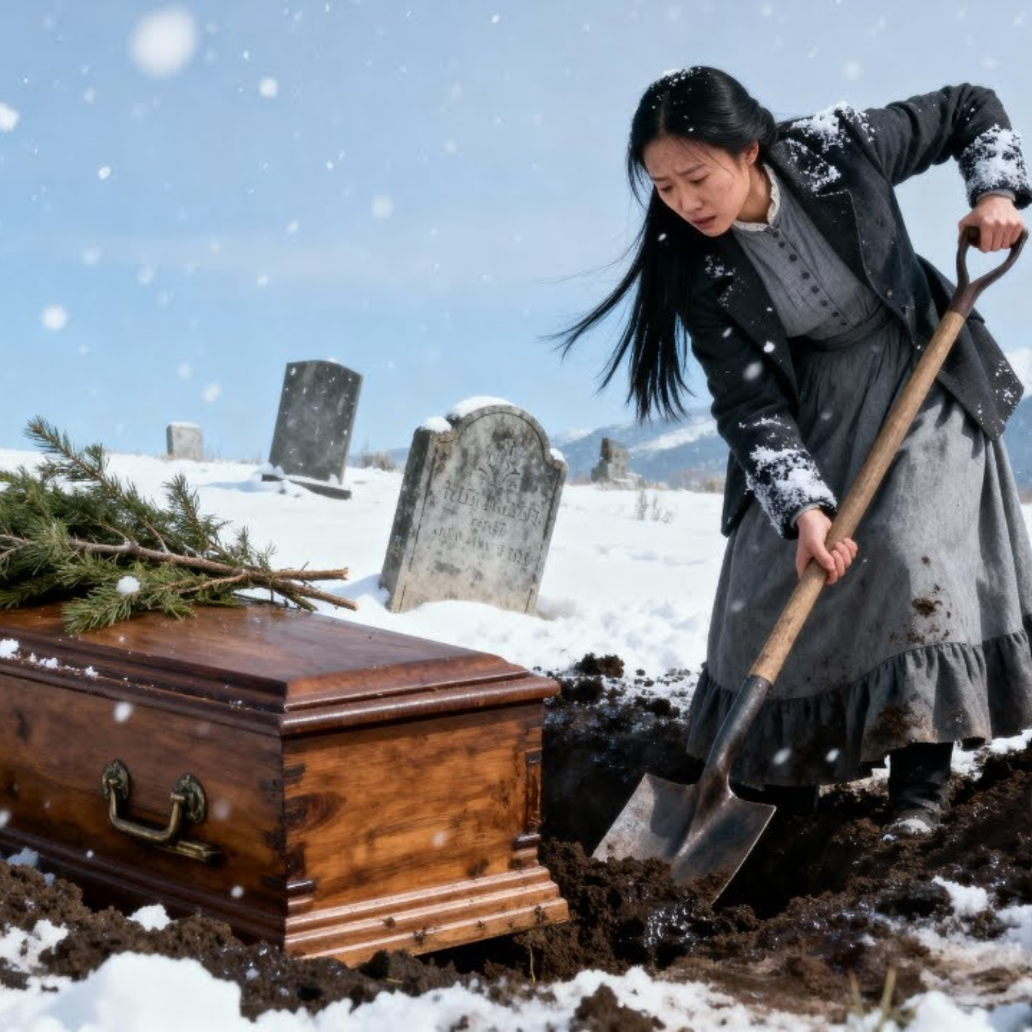 La pala impactó con una roca sumergida, el impacto sacudiendo sus huesos, y con un chasquido desagradable, el mango de madera se astilló, dejándola sosteniendo un trozo inútil de madera mientras la pala de metal yacía burlándose de ella en la escarcha. May miró la herramienta rota, la realidad de su situación cayendo sobre ella con el peso de una montaña. Estaba sola, miles de millas de su aldea natal, con un esposo que no podía enterrar y un invierno que no mostraba piedad. Cayó de rodillas, no en oración, porque sentía que los cielos se habían vuelto en contra de este lugar hace mucho tiempo, sino por un colapso físico puro, raspando la dura tierra con sus dedos desnudos hasta que sus uñas se rompieron y la sangre se extendió oscura sobre la nieve blanca.